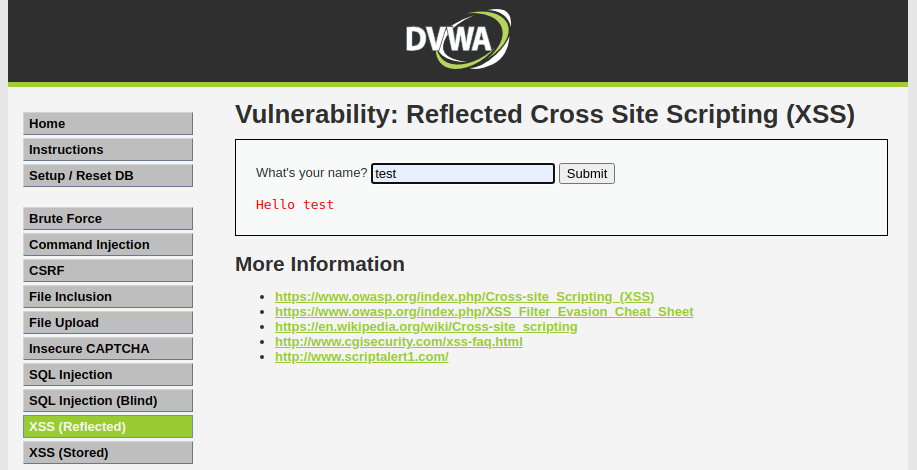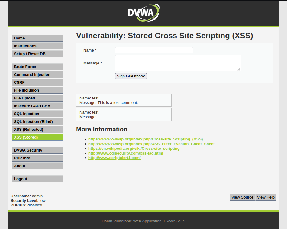 ※ "화이트 해커를 위한 웹 해킹의 기술" 강의 및 책에 수록된 실습이다. ※ 허가 받지 않은 웹사이트에 해킹을 시도 하는 것은 불법. ※ dvwa 등 테스트 가능하게 만들어진 곳에서만 모의해킹을 해야한다. Stored XSS는 스크립트 코드가 서버에 저장된 후에 이루어지는 공격이다. 한 번 스크립트를 삽입하고 나면 그 페이지에 접속하는 모든 사용자가 공격 당하게 된다. 따라서 Reflected XSS보다 위험하다. security level을 low로 설정한 뒤 이번에는 Stored XSS 탭으로 간다. 게시글을 저장할 수 있는 방명록이 있다. 여기에 Reflected XSS 실습할 때 쓴 코드를 저장해보자. 입력 글자 수 제한이 걸려있어 코드 전부 삽입이 안 될 수 있다. 입력 글자 수를 클라이언트 ..